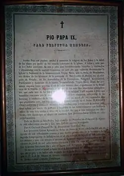 40 días de indulgencias a todas las personas que rezaren un pater noster y ave María al gloriosísimo San Joseph, en el altar nuevamente erigido al santo Patriarca en la referida ermita y también 40 días de indulgencias a todos los que celebraren el santo sacrificio de la Misa o dieren limosna para que se celebre alguna en honra y culto del benditísimo Sr. San Joseph en dicho altar.Libro del Santuario[26]