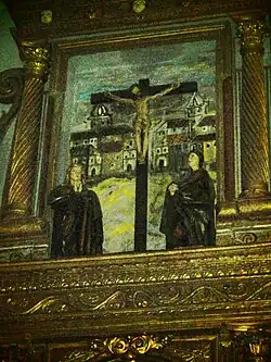 La capilla actual, donde está situado el retablo mayor, en su día estuvo separada del resto de la nave, que normalmente era la que ocupaban los fieles, por una reja de madera de la que aún quedan restos en el arco donde estuvo empotrada y otros trozos arrinconados en el «Camarín». En el siglo XVIII se tomó la decisión de poner una cerradura en la puerta que tenía la reja en su parte central, al objeto de poder abrirla para que los peregrinos que llegasen pudiesen permanecer en la nave central y divisar la imagen de la Virgen sin, por ello, quitar la intimidad que tenían la capilla mayor y el «Camarín», así como los dos altares colaterales. En esa misma época se pusieron cerraduras en el acceso a las campanas para que solo el sacristán pudiera tener acceso a ellas. Según figura en el Libro del Santuario, en 1720 se pagaron «tres rs.» por las cerraduras de la reja y del campanario. Corona el retablo una pintura de Jesús en la cruz con su madre y otra mujer a los pies.[29]