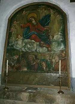 Con otros 400 reales se pagó al pintor Jerónimo de la Cassa por las pinturas de ambos colaterales y por los frontales. En estos altares hay sendos frescos, uno que representa la Asunción de Nuestra Señora, que tiene la siguiente leyenda en latín: exaltata est, sancta Dei Genitrix, super coros angelorumin coelestia regna; y otro que representa la Coronación de la Santísima Virgen como reina de los ángeles y tiene la siguiente leyenda: Regina Angelorum.[20] El «Libro del Santuario» dice textualmente en su folio 39: