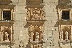 En el exterior del templo, el único acceso se produce desde la fachada. Esta es de sillería («opus quadratum») con tres vanos elevados, de medio punto, de los que los dos laterales permanecen cegados.