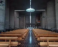 El interior de la iglesia es a nave única con seis capillas a cada lado; que dan al interno de la nave. La nave presenta una cobertura con techo plano en cemento con un tiburio cónico en correspondencia del presbiterio. El área presbiterio, un poco más alta que el resto de la iglesia, está hecho enteramente en mármol blanco, al centro se encuentra el altar mayor, detrás de este la sede, a la izquierda el ambón y a la derecha, sobre una pequeña columna, el tabernácolo.[1]