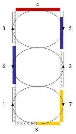 Este movimiento crea tres círculos interconectados, cada uno de ellos por un tema específico. El sacrificio es el eje de la narrativa, que se encuentra en el centro de cada una de las caras principales, y en torno a este giran las acciones de los otros dos círculos. Las dos escenas de libación de cada una están conectadas, formando una esfera al este del círculo del sacrificio. El círculo que se forma al oeste, es donde comienza y termina el viaje, y donde el fallecido o el espectador deben decidir si continuar el camino o poner fin a la historia.[41]