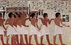 Varios túmulos tebanos de la dinastía XVIII tienen representaciones convencionales de procesiones fúnebres y procesiones que traían ofrendas, regalos de los emisarios de Keftiu.[47][n 14] Estas representaciones de Keftiu tienen cierta similitud con los personajes de la cara oeste del sarcófago.[n 15] La presencia minoica en los frescos egipcios refuerza la idea de que hubo un intercambio de técnicas y conocimientos entre estos pueblos.[48] Varias representaciones egipcias también tienen información sobre lo que podrían haber llevado los emisarios minoicos como ofrenda: cerámica, tejidos, lingotes de cobre, joyas y, en dos de los casos, estatuas de toros. En el arte minoico, el único fresco en el que las ofrendas están compuestas por otros objetos, como la cerámica, es el del sarcófago de Hagia Triada. La idea de que en la procesión de ofrendas hayan estatuas de toros se ve como una prueba de la influencia egipcia, igual que el modelo del barco. Las representaciones de navíos en un contexto funerario son bastante extrañas, respecto a la cantidad de representaciones de estos que hay en los sellos.[n 16] Los barcos no están representados de forma aislada a los elementos religiosos y no parecen tener otro significado más allá de lo que es, un barco. Además, los navíos de los sellos minoicos se representaban con un mástil, una vela en forma de filo y remos. En el sarcófago vemos todo lo contrario: el barco representado solo consta del casco. Nuevamente se puede hacer un paralelismo con la tradición egipcia de los navíos, donde es un símbolo importante de su cultura.[49] En los túmulos de la nobleza de Tebas, como el de Hatshepsut y el de Amenofis II (1479-1392 a. C.) encontramos imágenes de embarcaciones que llevan difuntos. El estilo del barco del sarcófago se aproxima mucho más a estas representaciones tebanas que a cualquier representación minoica.[50]