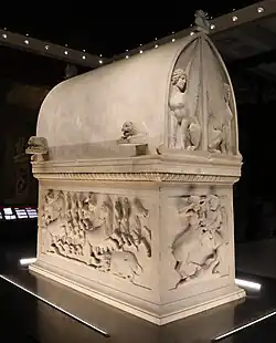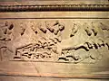 El sarcófago está decorado con relieves; los relieves laterales ilustran una cacería de leones y de jabalíes, mientras que los relieves de los extremos muestran centauros y esfinges luchando.[5]