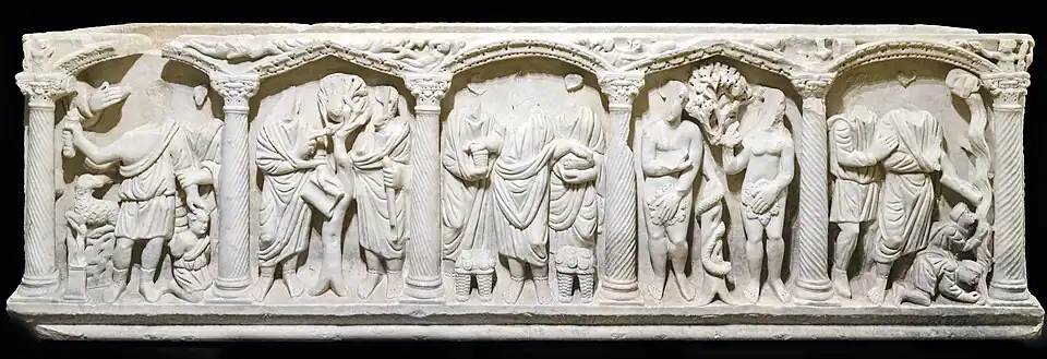 - El sacrificio de Isaac, arrodillado, dispuesto a morir junto a su padre Abraham de pie en el centro con un cuchillo. Abraham calza borceguíes típicos de pastor, mientras que Isaac va descalzo. Detrás se aprecia el cordero que va a sustituir a Isaac en el sacrificio, mientras que Sara parece agarrar el brazo de Abraham, al igual que en muchos sarcófagos, aunque aquí lleva toga, quizás debido a un error del escultor. Finalmente, Dios al fondo ordenando parar la acción.