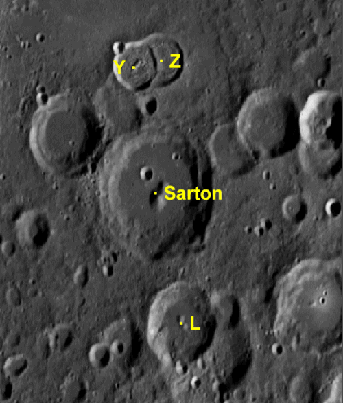 Por convención estos elementos se identifican en los mapas lunares colocando la letra en el lado del punto central del cráter más cercano a Sarton.