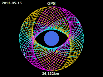 Los satélites GPS giran alrededor de la Tierra a una altitud de unos 20 000 km (veinte mil kilómetros) y completan dos órbitas completas cada día.[2]