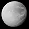 Mimas es el más pequeño y menos masivo de los satélites clásicos interiores,[53] aunque su masa es suficiente para alterar la órbita de Metone.[52] Tiene una forma notablemente ovoide, ya que se ha acortado en los polos y se ha alargado en el ecuador alrededor de 20 km por los efectos de la gravedad de Saturno.[54]