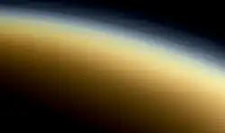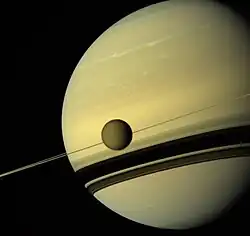 Titán es un satélite natural de Saturno, concretamente el mayor de entre los que orbitan este planeta y el segundo mayor del sistema solar en su conjunto, tras Ganímedes. Además, destaca por ser el único satélite conocido que posee una atmósfera relevante,[71] y el único astro, aparte de la Tierra, en el que se ha encontrado evidencia clara de cuerpos líquidos estables en la superficie.[72]