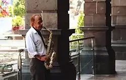 Hombre tocando una melodía con saxofón en Puebla, México.