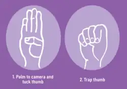 La señal se realiza levantando una mano con el pulgar metido en la palma, luego doblando los otros cuatro dedos hacia abajo, atrapando simbólicamente el pulgar con el resto de los dedos.[5][6][7][8] Fue diseñado intencionalmente como un solo movimiento continuo de la mano, en lugar de un letrero sostenido en una posición, para que pudiera hacerse fácilmente visible.