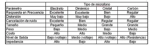 La calidad del micrófono probablemente es, el factor que más influye en la adquisición electrónica de señales del habla es el tipo de micrófono que se está usando. Existen, principalmente, cuatro tipos de micrófonos disponibles en el mercado, los cuales son el electreto, el dinámico, el de cristal y el de carbón. Para percibir fácilmente las diferencias entre estos tipos de micrófonos, sus características principales son comparadas en la siguiente tabla.