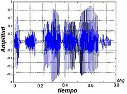 La señal de voz está constituida por un conjunto de sonidos generados por el aparato fonador. Esta señal acústica puede ser transformada por un micrófono en una señal eléctrica. La señal de voz en el tiempo puede ser representada en un par de ejes cartesianos. Como todo los sonidos, está formado esencialmente por curvas elementales (senos y cosenos) pero las posibles combinaciones de éstas pueden ser complejas. A manera de ejemplo, se muestra la forma de onda de la palabra ‘explorador’ (Imagen extraída de [Peralta, Cotrina. 2002]). La representación de la señal de voz en función del tiempo es importante puesto que brinda información sobre características importantes como la energía y los cruces por cero, las cuales facilitan su estudio y análisis.