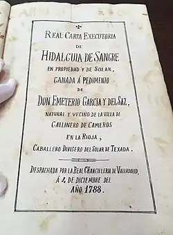 Otorgado como reconocimiento en 844 por el rey Ramiro I de Asturias a Sancho Fernández de Tejada, general en la mítica Batalla de Clavijo acaecida, según la leyenda, en mayo del 844.[4] Este premio, que se otorgó a Sancho y sus trece hijos, suponía una serie de privilegios de hidalguía para ellos y sus descendientes, entre otros el uso de un escudo heráldico y también la vigilancia del recién creado Camino de Santiago desde sus castillos de Viguera y Clavijo.