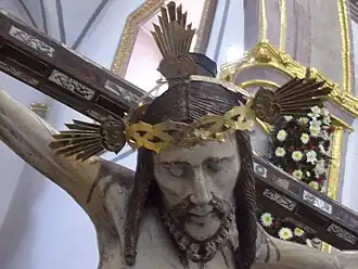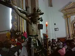 La imagen tiene una cruz hecha de madera de nogal y detalles de marfil llamadas tablillas que fueron traídos de Filipinas.[3] En la cabeza, el cristo lleva una corona de espinas, bañada en oro y lo que cubre sus partes nobles es un sendal de terciopelo con un cordón, esos detalles hacen de la imagen una visualización única que la diferencia de otras imágenes de Jesucristo de otras parroquias cercanas.