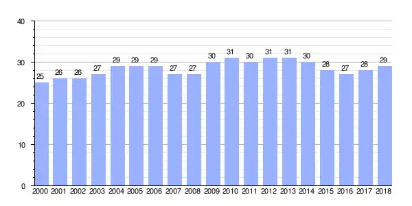 | Gráfica de evolución demográfica de Seares de Abaixo entre 2000 y 2018 |