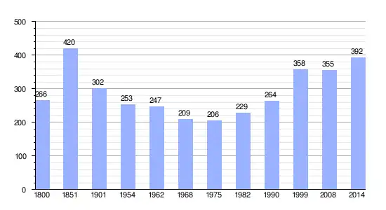 Los datos demográficos contemplados en este gráfico de la comuna de Secqueville-en-Bessin[4] se han cogido de 1800 a 1999 de la página francesa EHESS/Cassini, y los demás datos de la página del INSEE.[5]
