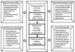 La secuenciación del genoma del cáncer utiliza la misma tecnología que la secuenciación del genoma completo. La historia de la secuenciación ha recorrido un largo camino, originado en 1977 por dos grupos independientes: la técnica de secuenciación enzimática del ADN didoxilado de Fredrick Sanger[27] y la técnica de degradación química de Allen Maxam y Walter Gilbert.[28] Después de estos artículos de referencia, más de 20 años más tarde nació la "segunda generación" de secuenciación de alto rendimiento (HT-NGS), seguida de la "tercera generación de tecnología HT-NGS" en 2010.[29] Las figuras de la derecha ilustran el proceso biológico general y las empresas que participan en la secuenciación HT-NGS de segunda y tercera generación.