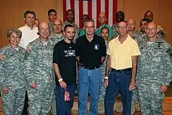 ![]() Gonsalvez, Stansell y Howes, contratistas estadounidenses empleados de Northrop Grumman que fueron secuestrados por las FARC-EP posan junto a soldados estadounidenses tras la operación de rescate. | ||
