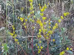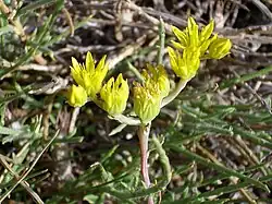 Hierba vivaz, baja y esbelta con tallos ascendentes. Hojas verde grisáceo, muy imbricadas, cilíndricas-estrechas, puntiagudas, trilobuladas y que abrazan el tallo en la base. Flores amarillas, de 12-16 mm, con 5-8 pétalos usualmente con una vena central roja y dispuestas en grupos laxos, con 10-16 estambres.