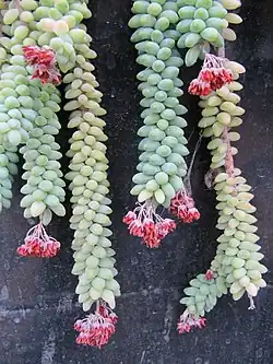 El sedum burrito (Sedum burrito) es una especie de la familia de las crasuláceas, comúnmente llamadas, siemprevivas, conchitas o flor de piedra (Crassulaceae), dentro del orden Saxifragales en lo que comúnmente llamamos plantas dicotiledóneas, aunque hoy en día se agrupan dentro de Magnoliopsida. El nombre del género significa “sedentario” o “estar sentado”, esto probablemente por sus hábitos de crecimiento; la especie está dada aparentemente por la similitud entre su hábito de crecimiento y la cola de un burro.