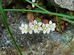 Es una planta perenne, piloso-glandulosa en todas su partes, a veces incluso algo viscosa. Raíz principal generalmente desarrollada, con numerosas raicillas finas que nacen también de los tallos laterales. Tallos de hasta 15 cm, que nacen del centro de las rosetas basales, poco divididos, foliosos; numerosos renuevos estériles. Hojas 6-14 x 1,5-5,5 mm, alternas o, a veces, subopuestas, obovales u oblongo-espatuladas, carnosas, planas por la cara superior, verdosas. Inflorescencia en panícula pauciflora, con pequeñas brácteas carnosas, oblongas. Flores pentámeras; pedicelos 1,5-2,5 mm. Sépalos 2,5-3 x 1,5-2,5 mm, oval-oblongosu ovales, agudos. Pétalos 5,5-6(7) x 2,5-3(3,5) mm, estrechamente oblongos,agudos, blancos o rosados, con un nervio dorsal a menudo rojizo, soldados en la base 1/3-1/4 de su longitud. Estambres 10, más cortos que los pétalos; filamentos blancos, generalmente con algunas papilas hialinas en sus bordes; anteras moradas, en forma de herradura. Folículos 2,5-3,5 mm, erectos, de color castaño claro, pelosos por su cara interna; estilo de 1 mm. Semillas numerosas,diminutas, ovoides; testa acostillada; ápice agudo. Tiene un número de cromosomas de n = 9; 2n = 18, 20, 60.[1]