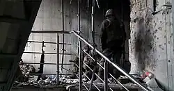 Combatiente del batallón Somalia cerca de un área muy dañada (octubre de 2014) -