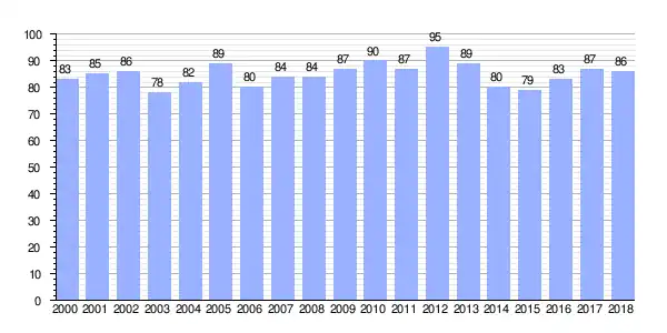 | Gráfica de evolución demográfica de Seixas entre 2000 y 2018 |