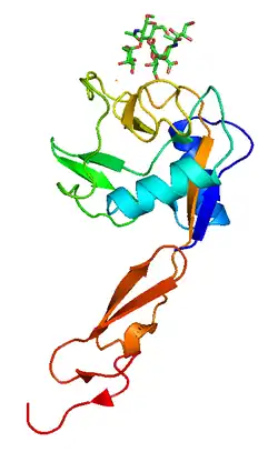 Lectina, Factor de crecimiento epidérmico, Proteína reguladora del complemento, Región transmembranal, Región intracitoplásmica C-terminal. | |