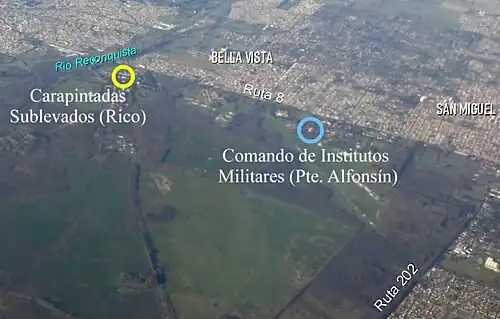 El helicóptero aterrizó en el Batallón de Aviación del Ejército y de allí el presidente y sus acompañantes fueron trasladados en auto al Comando de Institutos Militares, (donde luego se instalaría la Dirección General de Educación), a 2,5 km al noroeste de la Escuela de Infantería donde estaba Rico y el resto de los militares rebeldes.[58]