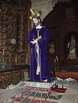 Representa a Jesús preso tras ser prendido en el Huerto de los Olivos y abandonado por sus discípulos. María Santísima del Dolor y Sacrificio sin palio.
