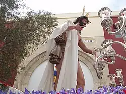 La iconografía nos presenta a Cristo, sentado en una roca sólo con un paño de pureza. Refleja el momento en que Jesús en actitud meditabunda y apenada espera su crucifixión. Es el momento comprendido entre el despojo de las vestiduras y la Crucifixión, mientras dos sayones preparan la cruz y dos soldados romanos montan guardia. Nuestra Señora del Desconsuelo bajo palio.