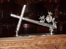 Su escudo está compuesto por una cruz con dos escaleras con sudario encima de un Monte Calvario con una calavera a los pies de la cruz, todo ello rodeado por corona de espina, con la corona Real en su parte superior.