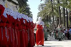 El cortejo comienza con la cruz de guía, que señala el inicio de la procesión. Esta suele ir acompañada de nazarenos con faroles. A continuación desfilan los nazarenos, vestidos con túnicas y capirotes según la cofradía a la que pertenecen. Estos portan cirios o cruces, y entre sus filas se intercalan diversas insignias como el senatus, el simpecado, el estandarte corporativo y el libro de reglas.
