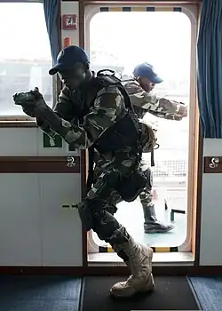 Efectivos senegaleses practican técnicas de desalojo de espacios y movimientos tácticos a bordo del patrullero de la Guardia Civil españolaRío Segura en 2014