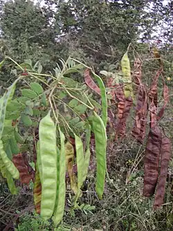 Es una planta arbustiva que alcanza un tamaño de 0,5-1 m, raramente dos metros de altura con un porte ramificado, con tallo erecto de color verde pálido y propagación de largas ramas que llevan cuatro o cinco pares de hojas. Los foliolos varían de 4 a 6 pares, totalmente afilados, con una en el ápice. Las nervaduras centrales se dividen por igual en la base de los foliolos. Las flores en forma de racimo con grandes flores de color amarillo que tienden al marrón. Su legumbre en forma de cuernos, ampliamente oblongos, comprimidos y planos contiene cerca de seis semillas.