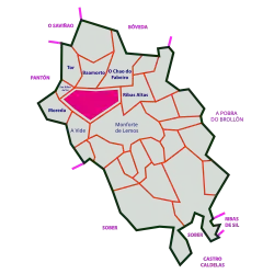 - ↑ «Orden de 21 de abril de 1999 por la que se determinan los nombres oficiales de los topónimos que se relacionan, pertenecientes a los municipios de Bóveda, Cospeito, Guitiriz, O Incio, Monforte de Lemos, Paradela, A Pobra do Brollón, Quiroga, Rábade, Samos, Sarria, Triacastela y Xermade (provincia de Lugo).». Diario Oficial de Galicia n.º 83. España. 3 de mayo de 1999. p. 5212. Consultado el 25 de abril de 2021.