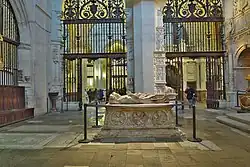 La figura del yacente es completamente realista, por lo que se cree que puede ser un retrato sacado de una mascarilla mortuoria. Sus vestiduras y los almohadones donde apoya la cabeza están realizados con un gran virtuosismo.