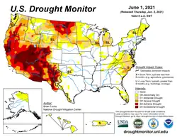 ![]() Mapa del Monitor de sequía en Estados Unidos que muestra el crecimiento de condiciones de sequía "extremas" o "excepcionales" en gran parte del oeste de los Estados Unidos y otros territorios a partir del 1 de junio de 2021 | ||