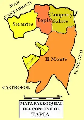 Al igual que en toda la cornisa cantábrica, en el concejo de Tapia la dispersión de la población en el territorio es muy grande. El concejo se divide en parroquias, formadas a su vez por numerosos lugares o barrios -pequeños grupos de casas- muy dispersos por todo el territorio. Este hecho se debe principalmente al régimen histórico de propiedad de la tierra típico en toda la región: propiedad privada minifundista muy fragmentada en pequeñas parcelas.