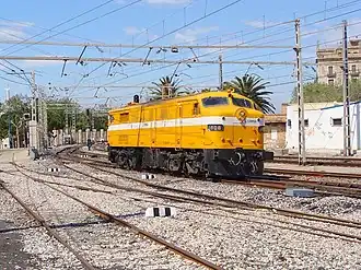 ![]() Locomotora 316.008 (1608) de COMSA estacionada en la estación de Tarragona. | ||