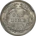 En el reverso, presenta una corona de maíz, trigo, arce y roble, unidas por una cinta, las cuales rodean las palabras «ONE DIME» (1/10 de dólar).