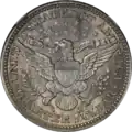 El primer intento de Barber, modelado para el medio dólar, hizo caso omiso de las instrucciones de Leech. En lugar de un diseño basado en la acuñación francesa, representaba una figura de pie de Columbia, con un píleo (una corona hecha de una rama de olivo) sobre un poste de la libertad; un águila desplegando sus alas se encuentra detrás de ella. El reverso utilizó el águila heráldica del Gran Sello de los Estados Unidos, encerrada dentro de una gruesa corona de roble, con las leyendas habituales rodeando el borde.[nota 1] Leech rechazó el diseño y Barber presentó un anverso con una cabeza de la Libertad similar al de la moneda adoptada. El director recibió comentarios de amigos y del secretario Foster; el 28 de septiembre, le escribió a Barber que los labios de la Libertad eran «bastante voluptuosos» y le indicó que preparara un reverso sin la corona, lo cual el jefe grabador hizo, pero luego se quejó en una carta del 2 de octubre al superintendente Bosbyshell, pero dirigida a Leech, en la cual manifestaba que las constantes demandas de cambios le estaban haciendo perder el tiempo.[26][27] Leech respondió, afirmando que no le importaba cuánto esfuerzo se gastara para mejorar el diseño, teniendo en cuenta que una vez emitidos, tendrían que usarse durante 25 años. La respuesta de Barber se transmitió al director el 6 de octubre con una carta introductoria del superintendente interino Mark Cobb (Bosbyshell estaba de viaje) que decía que Barber «niega cualquier intención de ser cauteloso y ciertamente no tuvo la intención de cuestionar su prerrogativa como uno de los funcionarios designados por ley para aprobar nuevos diseños para la acuñación».[28][29] La carta de Barber era una larga explicación técnica de varios elementos de diseño y solicitaba más consejos de Leech si tenía preferencias; su tono en general era argumentativo. El director decidió no volver a escribir, más bien solo abordó una inquietud, sobre si las ramas de olivo en el diseño se representaron con precisión, así que al visitar el Jardín Botánico Nacional, obtuvo una y se la envió a Barber.[15][28]