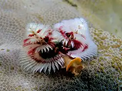 ![]() Spirobranchus giganteus es una especie de gusano tubícola de la familia de los serpúlidos. Notar el opérculo cartilaginoso extendiéndose desde el tallo branquial. | ||
