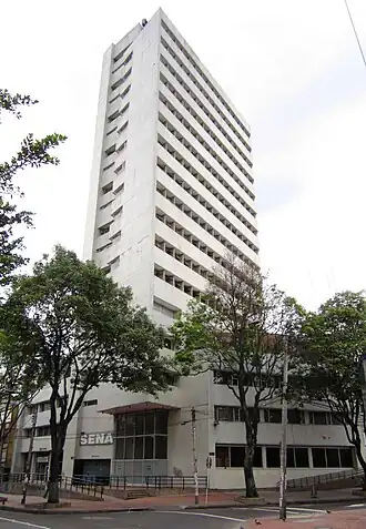 Por espacio de tres años desde 1957, la entidad tuvo como sede principal un edificio ubicado en la Calle 20 con Carrera 8. contando inicialmente con el apoyo de las más importantes organizaciones sindicales de Colombia.[12] Mientras que los primeros centros de instrucción fueron aulas del Instituto Técnico Central y de la Universidad Nacional de Colombia, así como improvisadas carpas de circos levantadas en ciudades y municipios, con el fin de ampliar su cobertura, con lo anterior la naciente institución buscaría atender las demandas de la empresa privada, el Gobierno y de los trabajadores, que exigían más capacitación en procura de mejorar su calidad laboral y de vida.