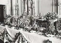 La vajilla estaba compuesta por muchos elementos, entre ellos: un surtout de table,[5] dos candelabros de siete velas, dos soperas altas, varias soperas con tapa, varias fuentes, cuencos, salseras, bandejas, cabarets, cubiertos, platos, saleros y otros.[6]