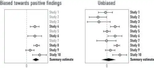 Los metanálisis y las revisiones sistemáticas pueden explicar el sesgo de publicación al incluir evidencia de estudios no publicados y literatura gris. La presencia de sesgo de publicación también se puede explorar mediante la construcción de un gráfico en embudo en el que la estimación del tamaño del efecto informado se compara con una medida de precisión o tamaño de muestra. La premisa es que la dispersión de los puntos debe reflejar una forma de embudo, lo que indica que el informe de los tamaños del efecto no está relacionado con su significancia estadística.[6] Sin embargo, cuando los estudios pequeños están predominantemente en una dirección (generalmente la dirección de tamaños de efecto más grandes), se producirá asimetría y esto puede ser indicativo de sesgo de publicación.[7]
