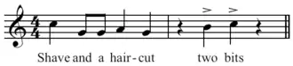 Shave and a Haircut y la respuesta asociada two bits es la verbalización anglosajona para un pareado, ostinato o fanfarria musical de llamada y respuesta de siete notas que se usa popularmente al final de una actuación musical, generalmente con un efecto cómico. Se utiliza de forma melódica o rítmica, por ejemplo, como golpe de puerta.