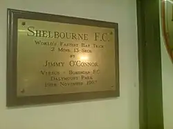 La placa conmemorativa en el Tolka Park del hattrick más rápido en la historia, conseguido por Jimmy O'Connor el 19 de noviembre de 1967.