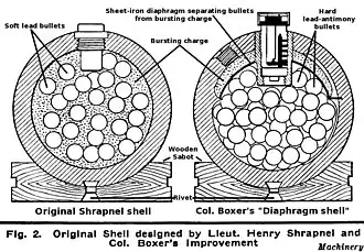 El diseño fue mejorado por el capitán E. M. Boxer del Royal Arsenal alrededor de 1852 y combinado cuando fueron introducidos los obuses cilíndricos para cañones con ánima estriada. El teniente coronel Boxer adaptó su diseño en 1864[2] para producir obuses shrapnel para los cañones de avancarga con ánima estriada: sus paredes eran gruesas y de hierro fundido, pero ahora la carga explosiva estaba situada en la base del obús con un tubo que iba a través del centro de este, para dirigir el fogonazo de la espoleta cronométrica montada en la punta a la carga explosiva de la base. Ésta rompía las paredes del obús y esparcía las balas.[3] Los fragmentos de las paredes del obús principalmente seguían su trayectoria, pero tenían poco efecto destructivo. El sistema tenía importantes limitaciones: el grosor de las paredes del obús de hierro fundido limitaba la cantidad de balas transportadas pero ofrecía poca capacidad destructiva, mientras que el tubo que iba por el centro igualmente reducía el espacio disponible para las balas.[4]